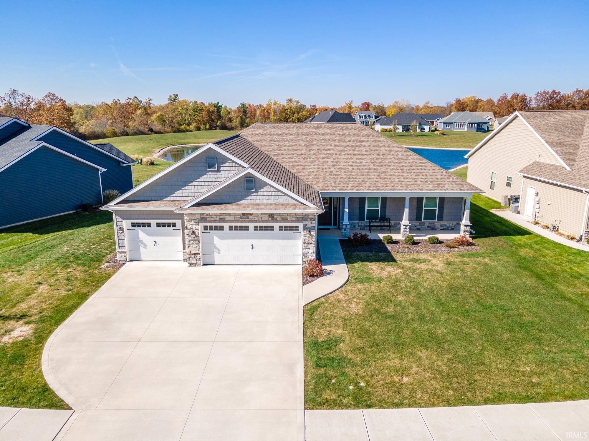 Welcome to Chandon Cove, a beautiful house nestled in the Azbury Park addition. This 3 bed 2 bath ranch features an open concept, split bedroom floor plan with almost 2000 sqft. A vaulted ceiling and dark hardwood flooring greet you when entering into the foyer and continues into the living room with gas log fireplace. The tastefully styled kitchen showcases quartz countertops with stainless steel appliances and flows effortlessly into the dining area.  Rest in luxury within the confines of the main bedroom with hardwood floors, tray ceiling, ceiling fan; and the spa-esq ensuite with dual vanity, large walk-in closet, spacious tiled separate shower and garden tub.  On the opposite end of the house reside the other two bedrooms, the second full bath, and the den with French doors.  Enjoy the views of the backyard and pond from the comfort of the covered porch with ceiling fan. The community pool is a great place to enjoy some fun in the sun without the worry of maintenance.  This area is the perfect middle point for enjoying small town comforts with niche shoppes within the charming town of Roanoke or easy commute into Fort Wayne.