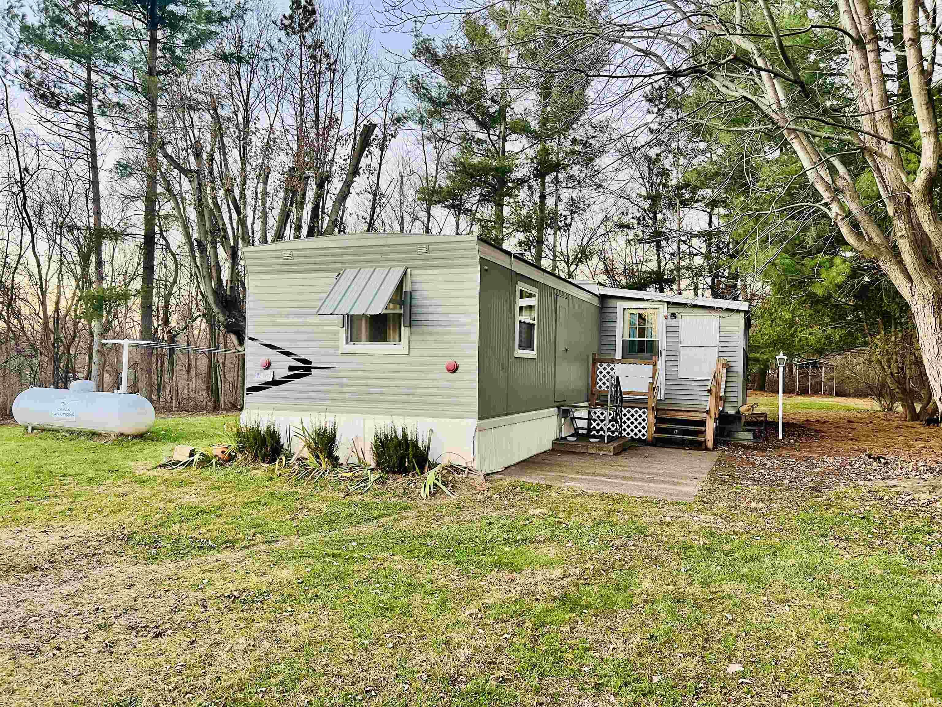 Furnished older mobile home in Holiday Woods sitting on 2 lots next to a beautiful wooded area. This home features 2 BR, 1 BA with a 1 car detached garage. All appliances, LR, kitchen & BR furniture stay with the home. This home has had a complete makeover! New water heater, bathroom remodel, new flooring and Pex water lines throughout. A great enclosed front porch. Outside has been repainted, 13 new double pane windows installed, roof recoated with fibered aluminum roof coating. And you will have access to Silver Lake. Home is being sold AS IS.