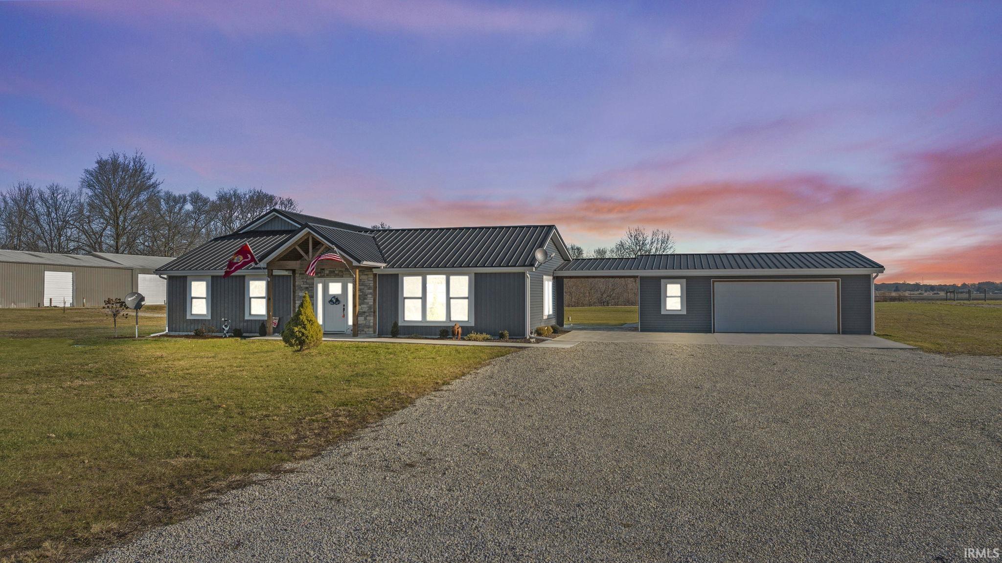 Welcome to your stunning ranch retreat nestled on 1.84 acres only 1 mile from the schools, 10 minutes to shopping, and 25 minutes to Fort Wayne! This newly constructed gem boasts an inviting open floor plan that seamlessly integrates the spacious living, dining, and kitchen areas. The chef's kitchen is equipped with stone countertops, stainless steel appliances, a charming window overlooking the scenic backyard and offers ample space with a large pantry ensuring convenience for your culinary needs. The oversized owner's suite is a haven of comfort, featuring barn door entries leading to the master bath and a generously sized closet. With 4 bedrooms, 3 full baths, and a backyard oasis...this home offers ample space for both relaxation and entertainment. Outside, indulge in the expansive partially covered stamped patio, perfect for hosting outdoor gatherings or simply unwinding in the midst of nature's tranquility. Embrace the privacy surrounding the property, creating a serene backdrop for your daily retreat. This is more than a home; it's an idyllic escape waiting for its new owner!