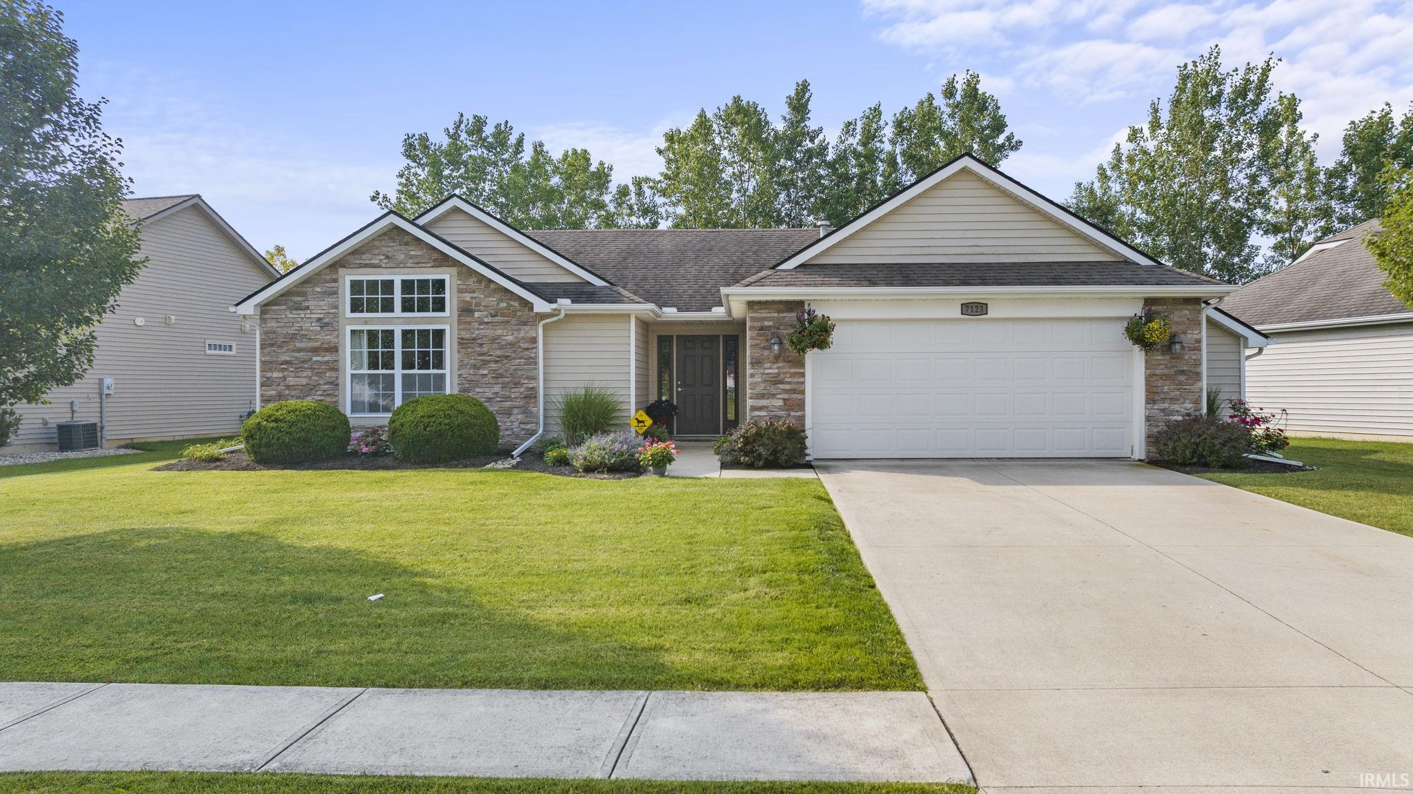 Amazingly maintained RANCH home in Stratford Forest neighborhood with pond + tree views; THREE bedrooms + TWO full bathrooms; 1300 square feet. Great room cathedral ceilings, windows flanking brick gas fireplace; open concept feeling to dining area, kitchen (appliances stay), seating at bar height counter. LARGE owner's suite (18x14), cathedral ceilings, display shelf, walk in closet full of upgraded built -in shelving + drawers, private FULL bathroom. Bedroom 2 and 3 with backyard/pond views, both with closet built-ins; FULL bathroom 2. Laundry space with built in ironing board; washer/dryer negotiable. TWO car attached garage has a 4' bump out, auto light, Rubbermaid Fastrack wall hooks. Enjoy the pond + tree views in a backyard that feels private with no houses directly behind.