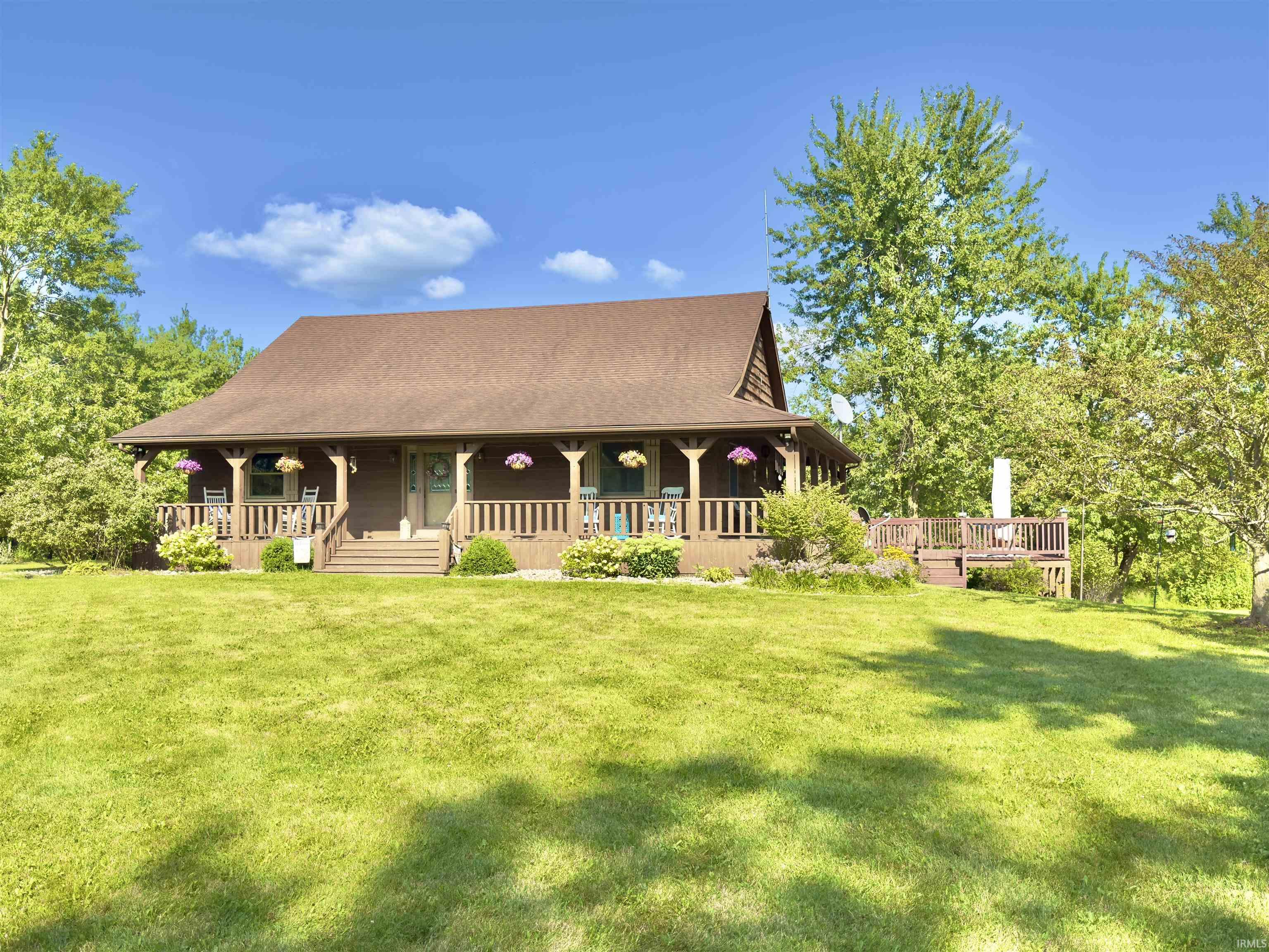 Welcome to your own serene country retreat! This beautifully updated ranch home, nestled on 3.18 acres of lush land, offers a perfect blend of privacy and luxury. Tucked away at the end of a long, private drive just off Lincoln Hwy/US-33, this 3-bedroom, 3-bathroom residence is surrounded by towering evergreens, ensuring seclusion. Step onto the expansive wrap-around porch and raised deck, ideal for relaxing, sunbathing, or hosting gatherings. The property boasts professional landscaping, tidy rock beds, and an abundance of trees, creating a true oasis to enjoy in any season. The driveway leads to an attached one-car garage and a detached outbuilding, perfect for storing equipment or setting up a workshop. Inside, you’ll be greeted by a stunning open-concept living, dining, and kitchen area with a vaulted wood plank ceiling and amazing floors. Quality craftsmanship shines throughout, with gorgeous wood finishes and modern lighting that enhance the rustic charm of the home. The completely renovated eat-in kitchen features custom cabinetry, stainless steel appliances, including a gas stove, fridge, and dishwasher, a farmhouse sink, and three custom skylights that flood the space with natural light. The luxurious master bath and finished walkout basement add to the home’s appeal, offering additional living space, a cozy family room with a gas fireplace, and plenty of storage. Enjoy the beauty of nature with mature maple trees, and multiple apple and peach trees on the property. Plus, the septic system was serviced just last year, ensuring peace of mind. This home truly offers the best of country living with modern comforts. Please note, some photos have been digitally enhanced.