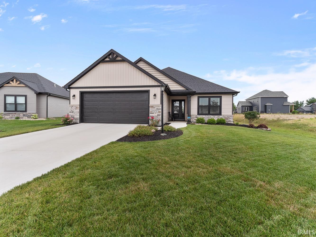 Why wait to build when you can move right into this like-new, immaculately maintained ranch tucked away on a quiet cul-de-sac with peaceful pond views and a long list of designer upgrades? Built in 2022, this 3-bedroom, 2-bath home features a light-filled open floor plan and high-end finishes throughout. Step into the living room and be wowed by the stunning floor-to-ceiling stone fireplace—a true focal point that adds warmth and style to the heart of the home. The kitchen impresses with quartz countertops, a sleek tile backsplash, vented exhaust fan, and all stainless steel appliances (washer and dryer not included). Luxury vinyl plank flooring runs throughout the main living areas, while the bedrooms and living room feature upgraded carpet with premium padding for extra comfort. Standout features and upgrades include: Gorgeous stone fireplace in the living room,Frameless glass shower door in the primary bath, Closet organizers throughout the home, Designer light fixtures with dimmer switches, Custom Blinds installed in every room,Custom mudroom bench, and laundry folding counter, and a professionally installed irrigation system with separate meter. Step outside to enjoy the beautifully landscaped backyard with an extended concrete patio, stylish fencing, privacy panels, and built-in floral holders—perfect for entertaining or relaxing by the pond. Located in a desirable southwest Fort Wayne community close to shopping, dining, and major routes, this home is the total package—better than new, inside and out.