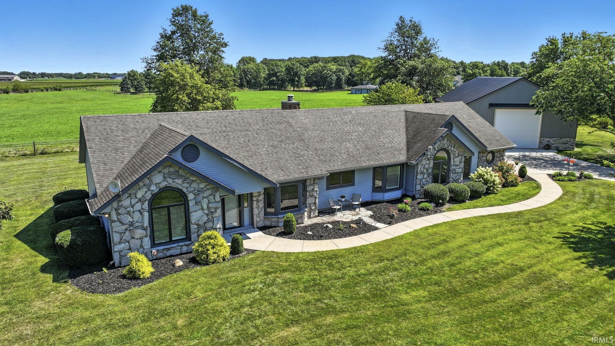 MULTIPLE OFFERS RECEIVED. Welcome to 8228 Bull Rapids Road, a serene country retreat on over 2 acres that perfectly blends comfort, functionality, and space inside and out. This one-story home offers 3 bedrooms, 2.5 baths, and multiple living areas, including a vaulted great room with a cozy stone fireplace, a remodeled kitchen with custom cabinetry, stainless appliances, and island seating, and a bright sunroom with walls of windows overlooking the countryside. The primary suite is a true retreat with dual vanities, a soaking tub framed by picturesque views, and a walk-in closet, while two additional bedrooms provide flexibility for family, guests, or office use. A laundry room with sink and cabinetry adds convenience, while the attached 3-car garage provides workbenches, a utility sink, drains, and abundant storage. The expansive outbuilding offers RV parking, overhead doors, workshop areas, loft storage, and even a half bath. Outside, mature trees, landscaped grounds, and multiple patios create the perfect setting for relaxation or entertaining—all just minutes from Woodburn, New Haven, and Fort Wayne. Schedule your showing today!