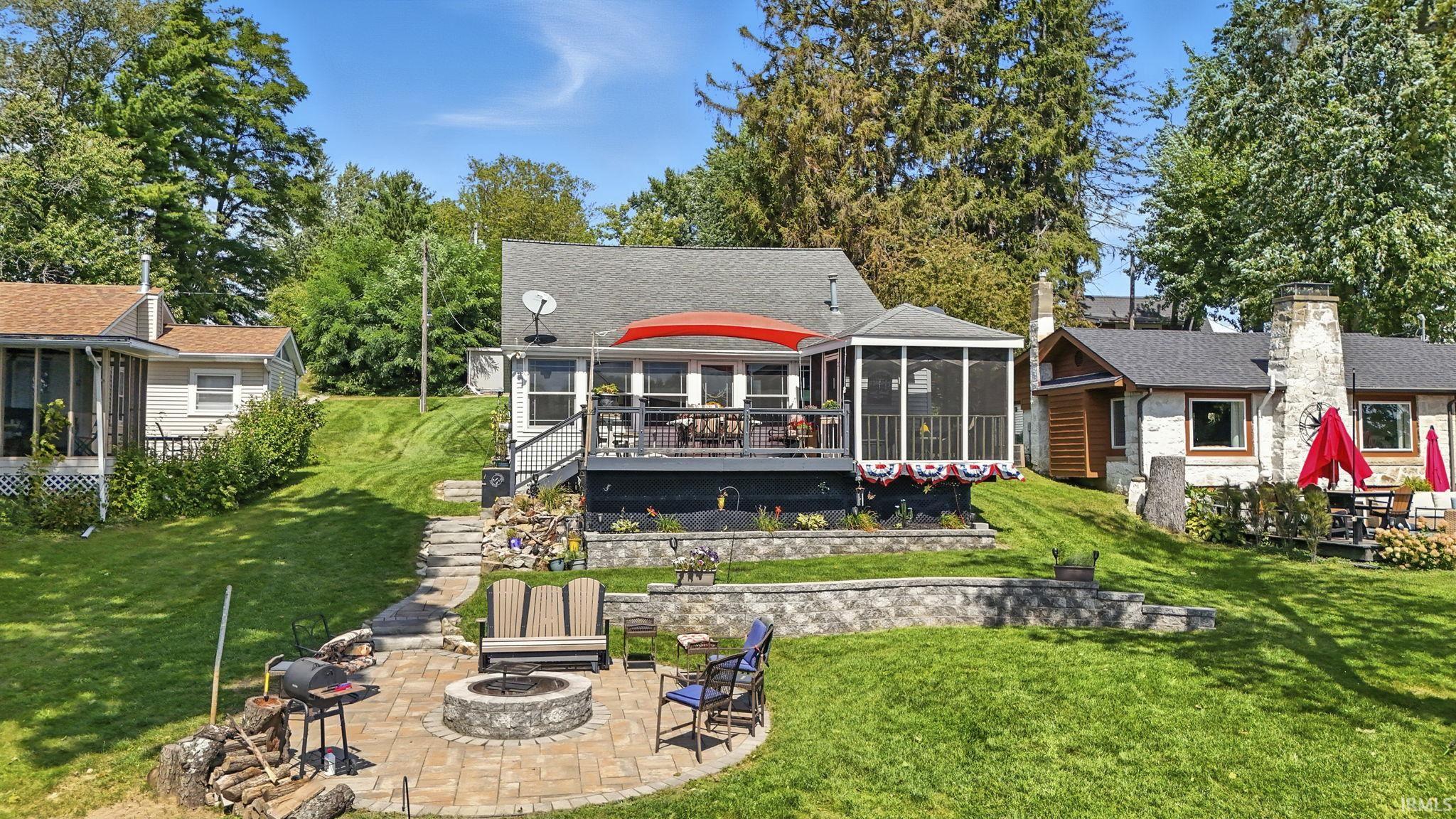 Beautifully updated 3-bedroom, 1-bath lakefront home offering 50 feet of frontage on Lake Papakeechie—a no-motor lake that ensures a quiet, serene environment with excellent swimming, floating, fishing or ice fishing. This 1,240 sq ft retreat features stunning lake views, a terraced lawn created with attractive retaining walls, that provides a level front (lake side) yard, a recently built 15 ft flagstone patio with firepit, and a large deck with a covered screen room, all perfect for enjoying everything the great outdoors has to offer. Inside, you'll find a remodeled kitchen with quartz countertops, a remodeled bathroom with a custom tile shower, newer windows on the lakeside, new LVP flooring on the main level, and an inviting living space with a gas fireplace and central air. The property includes a finished mancave shed with power and AC, ideal for hobbies, guests or relaxation, as well as two additional storage sheds (20x10 and 8x8) for all your tools and toys. Located less than half a mile from Lake Wawasee Family Fishing Area, which features three public fishing piers and a shaded picnic area, plus a public boat ramp for easy Wawasee recreation lake access. Nearby attractions include the Wawasee Area Conservancy Foundation nature trails, South Shore Golf Club, Man Cave Brewing Company, The Channel Marker seafood restaurant, and Ye Old Tackle Box for fishing supplies. Grocery, retail and restaurant options are just minutes away. This home offers a rare combination of tranquility, charm, and convenience.