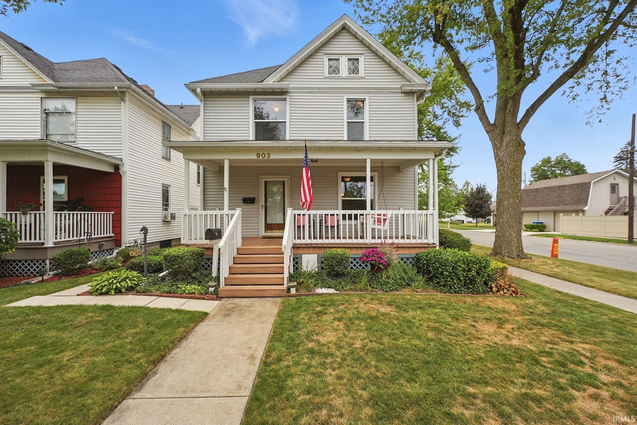 START SHOWING DATE: on this Auburn classic with timeless character. Poised on a sunny corner lot just blocks from downtown, this home invites you to imagine the history and heart within its walls. The front porch is pure Midwest Americana—made for porch swings, lemonade, and watching parades roll by. With original woodwork, tall trim, pocket doors, and a striking staircase, the home echoes the artistry of Auburn’s finest classics-built for beauty and built to endure. The formal dining room is the perfect backdrop for gathering family and friends. Upstairs offers three comfortable bedrooms and a full bath, with a convenient water closet on the main floor. A walk-up attic provides bonus storage or potential creative space. Outside, the fenced backyard and concrete patio invite you to unwind with a good book from the library just down the street. The former carriage house now functions as a one-car garage, complete with a charming three-paneled door.