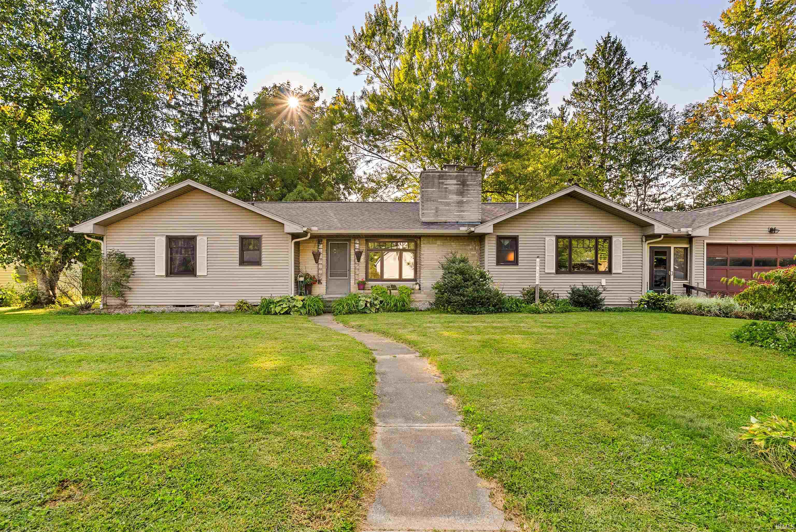 Mid Century Modern Ranch on 4 Tree lined lots! This one story ranch style mid century modern home built in the 1060's combines timeless design with modern comfort. Warm wood tones and natural light flow throughout the entire spacious open floor plan and finished basement totaling over 3000 finished square feet. The heart of the home includes: the eat in kitchen, featuring abundant cabinetry and stainless steel appliances, and the inviting living room with a fireplace that opens seamlessly to a large family room wrapped in windows, offering panoramic views of the expansive back yard. A vaulted ceiling, built in wet bar, and double doors in onto the patio, makes this an ideal space for gatherings. The main level offers 4 spacious bedrooms with great closet space and 1.5 bathrooms, while the partially finished full basement adds even more living space with another family room with the second fireplace, a game room, full bathroom, large laundry room with utility sink, and abundant storage space. A two car attached garage with a convenient mudroom are bonus features. Step outside to enjoy the beautiful patio and private, tree lined setting, with four city lots providing both space and privacy-all while being steps to Manchester University. This home is a true showplace and ready to move right in!