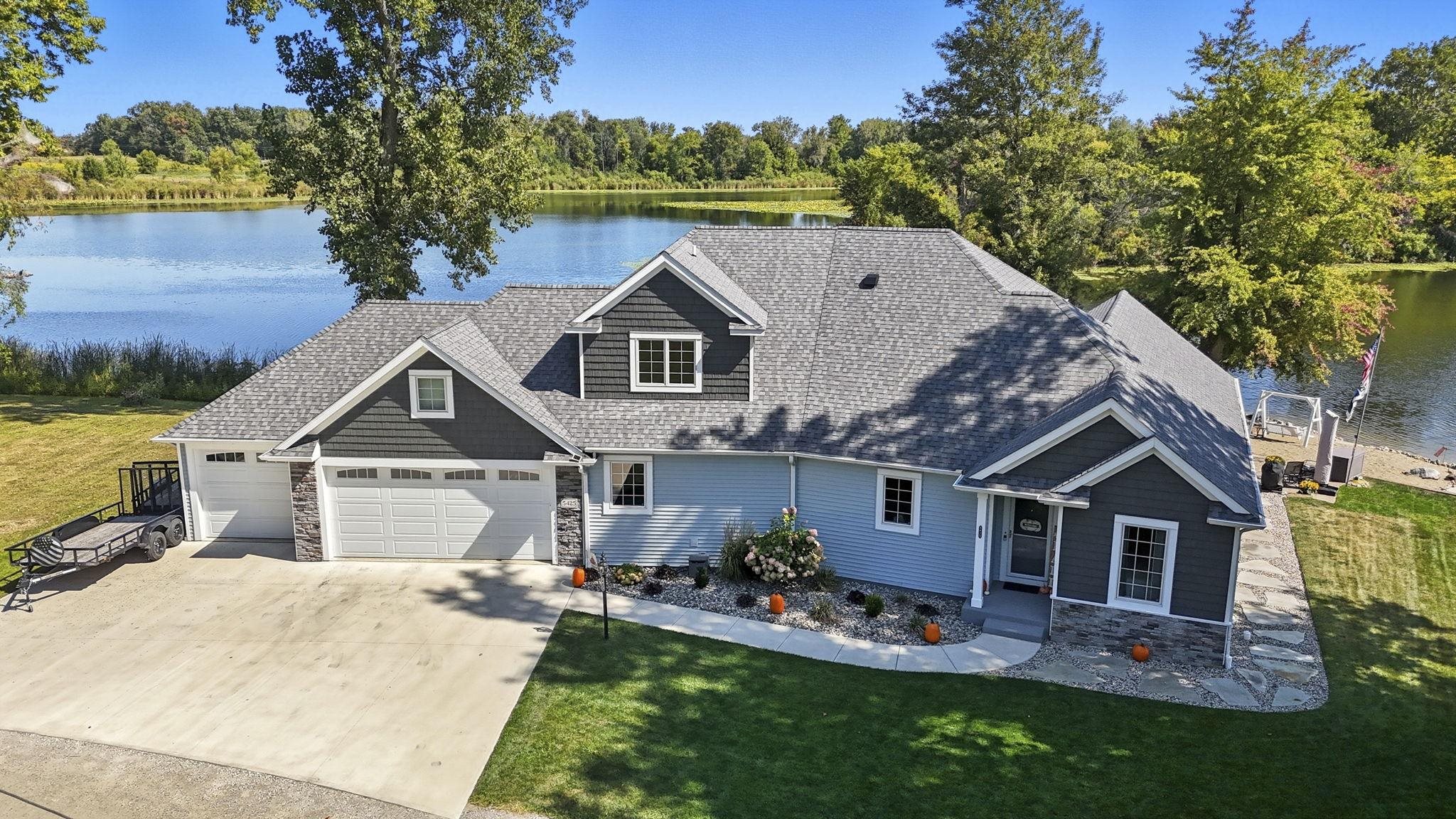 OPEN HOUSE 9/14 1-3pm!! Stunning custom built lakefront home by Bob Buescher. This Big Lake home sits on a ½ acre lot with over 160 feet of lake frontage and a private sandy beach in the peaceful no-wake zone between the 2nd and 3rd basin. Enjoy gorgeous views from tinted windows designed to keep the home cool, or relax on the covered concrete patio with steps leading to the beach. Inside, the gourmet kitchen features quartz countertops, custom cabinetry, Bosch 5-burner gas cooktop, massive island, and walk-in pantry. The main level offers a spacious primary suite, 1/2 bath, and den (currently used as a guest bedroom). Upstairs are two generously sized bedrooms, an office/den, full bath with tiled shower, and walk-in attic. Extras include custom built-ins, heated 3-car garage, floating dock, whole-house generator, owned water softener, 2 owned 1000 gallon propane tanks, gutter guards, and large concrete driveway. So many thoughtful details throughout - it must be seen to be fully appreciated. A rare opportunity to own a true lakefront paradise!